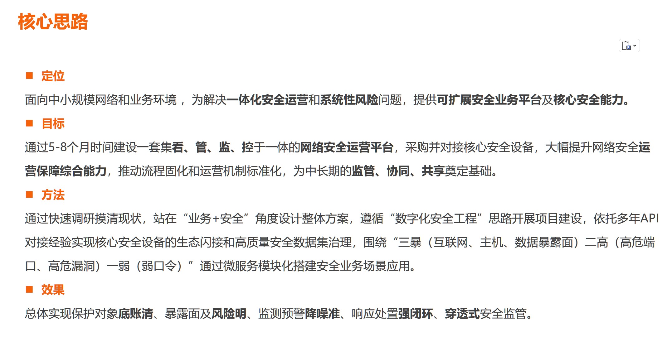 平台性成果:实现安全运营一体化,串联监测、响应等模块,支撑信息共享、工作协同、指标考核等。